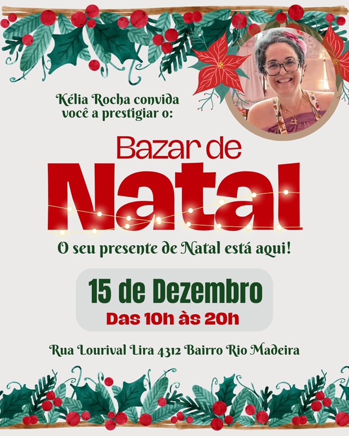 "Será um bazar principalmente com ítens natalinos , mas terá também outros produtos sem ser de natal. Servirei durante todo dia um delicioso lenche à todos", afirma a responsável pelo evento, Kélia Rocha.