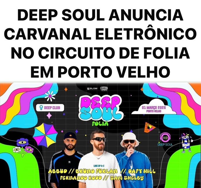 A produtora de eventos Deep Soul, conhecida pela realização de eventos eletrônicos na capital, traz mais uma novidade para os amantes desse ritmo. No sábado de Carnaval, dia 01 de março, a partir das 21 horas, a Deep Soul Folia acontecerá no Deep Club, transformando o local em uma verdadeira folia.