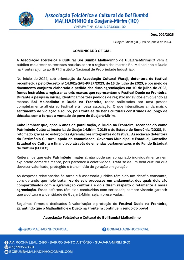 O advogado Moisés Legal dos Santos esteve na Secretaria de Cultural do Município de Guajará-Mirim para informar que as marcas dos bois de Guajará-Mirim, assim como do Duelo da Fonteira, são de propriedade dele.