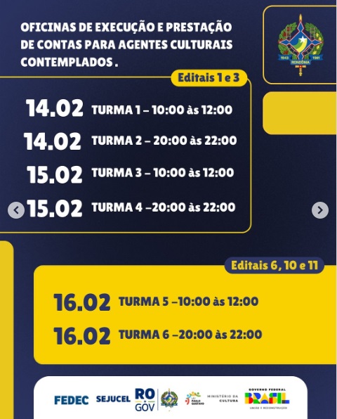 As oficinas serão focadas execução e prestação de contas dos agentes contemplados pela Lei Paulo Gustavo. São seis turmas disponíveis nesta sexta,14, e sábado,15. O encontro será no formato online, mas a Sejucel não passou por qual plataforma ocorrerá.