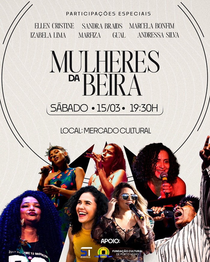 Este evento conta com o apoio e patrocínio de diversas instituições que acreditam na importância da cultura e na valorização da arte feminina: Patrocínios: ONGs Rioterra e Ecoporé, Strike 364, Júnior Sun, Castanhas Ouro Verde, Posto Solimões E Casa Quatro Produções. Apoio: Funcultural, Mercado Cultural e ST Eventos. Serviço: Data: 15 de março de 2025 (sábado) Horário: 19h30 Local: Mercado Cultural de Porto Velho Entrada gratuita
