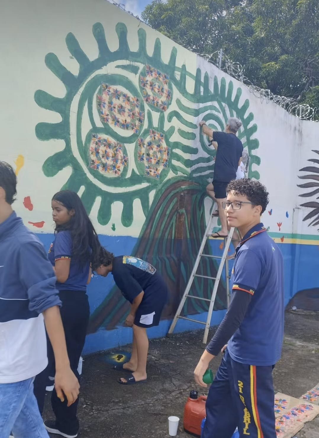 Os alunos que participaram da oficina ajudaram os artistas visuais na pintura realizada no muro da instituição de ensino.