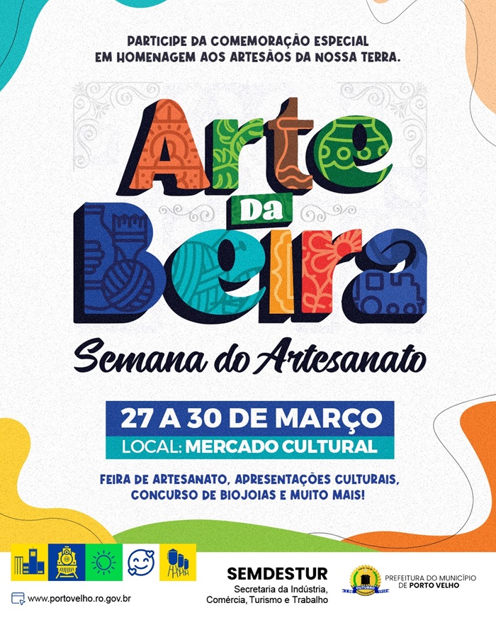 A Prefeitura de Porto Velho, por meio da Secretaria Municipal de Indústria, Comércio, Turismo e Trabalho (Semdestur), realiza de 28 a 30 de março o evento "Arte da Beira – Semana do Artesanato", em comemoração ao Dia do Artesão, celebrado neste 19 de março. A programação acontece na área externa do Mercado Cultural e reúne artesãos, artistas e a comunidade para valorizar a cultura e a economia criativa local.