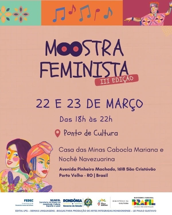 O evento cultural busca promover a reflexão sobre questões de gênero e o empoderamento feminino por meio da arte. A Mostra será realizada no Ponto de Cultura Casa das Minas Cabocla Mariana e Nochê Navezuarina, localizado na Avenida Pinheiro Machado, 1618 - São Cristóvão, em Porto Velho. O evento inicia às 18 horas e a entrada é gratuita.