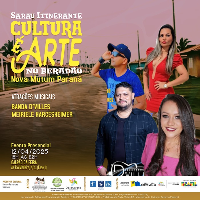 A atividade será das 18h às 22h e terá como palco o Galpão da Feira (Av. Rio Madeira, s/n., fase 1), no distrito de Nova Mutum Paraná. Esse é o segundo dia projeto cultural.