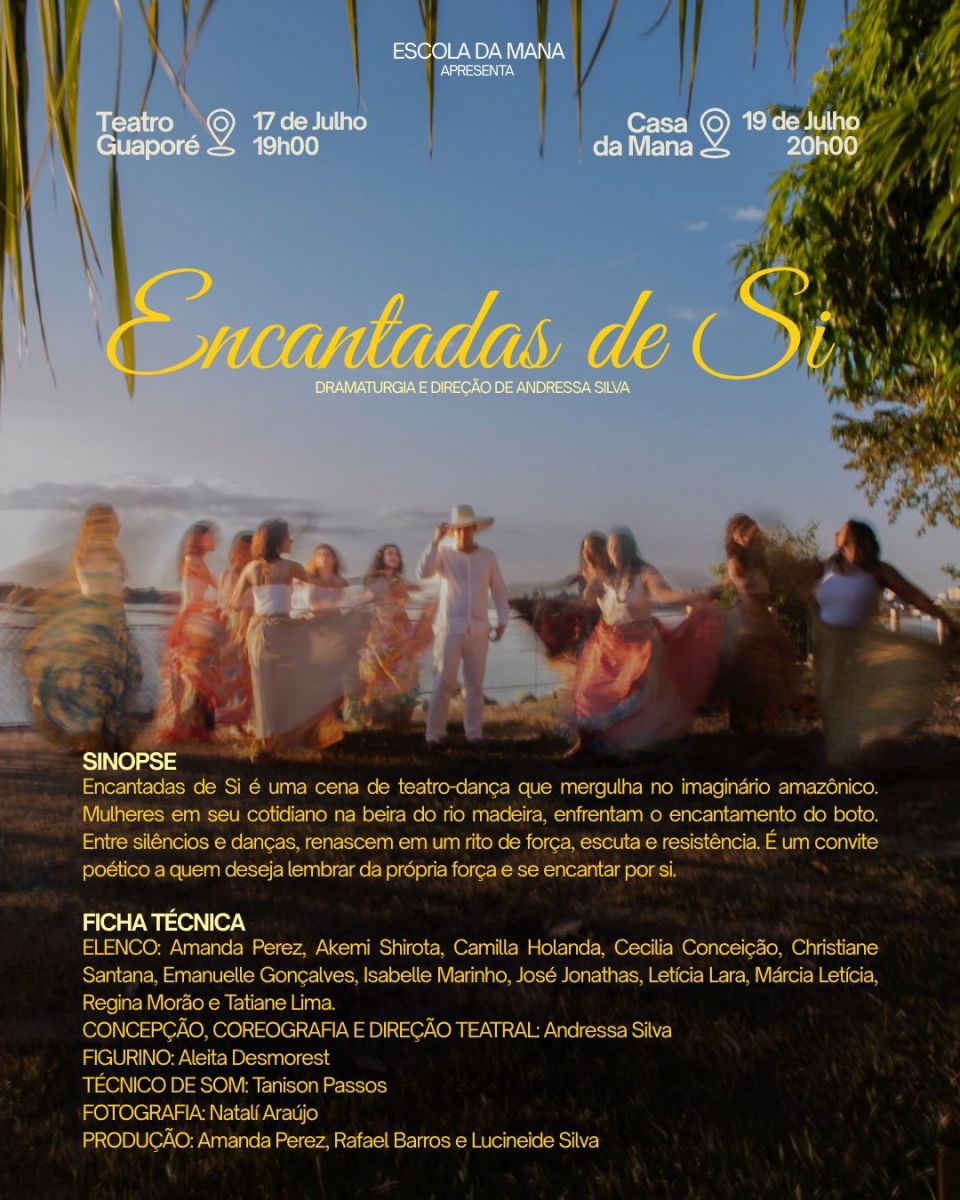 Com força feminina expressiva que conta suas histórias por meio do teatro, dança, cinema, literatura, música e gastronomia amazônica, as mostras culturais do dia 18 e 19 serão realizadas na Casa da Mana, localizada na rua Senador Álvaro Maia, 2527, bairro Liberdade. No dia 17, os espetáculos serão realizados no Teatro Guaporé, rua Tabajara, 148, bairro Olaria.