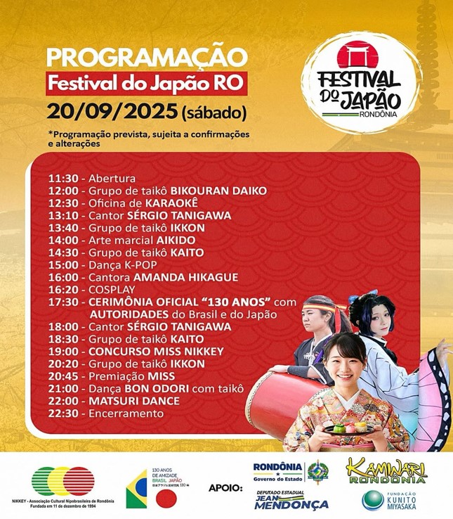 No próximo dia 20 de setembro, a capital rondoniense será tomada pelas cores, sons e sabores do Japão durante a segunda edição do Festival do Japão Rondônia. O evento, que comemora os 130 anos do Tratado de Amizade, Comércio e Navegação entre Brasil e Japão, promete uma imersão cultural completa, com shows de taikô, oficinas, gastronomia autêntica, concursos de cosplay e miss nikkey, além de cerimônias tradicionais e atrações modernas que refletem a forte influência japonesa na cultura pop global.