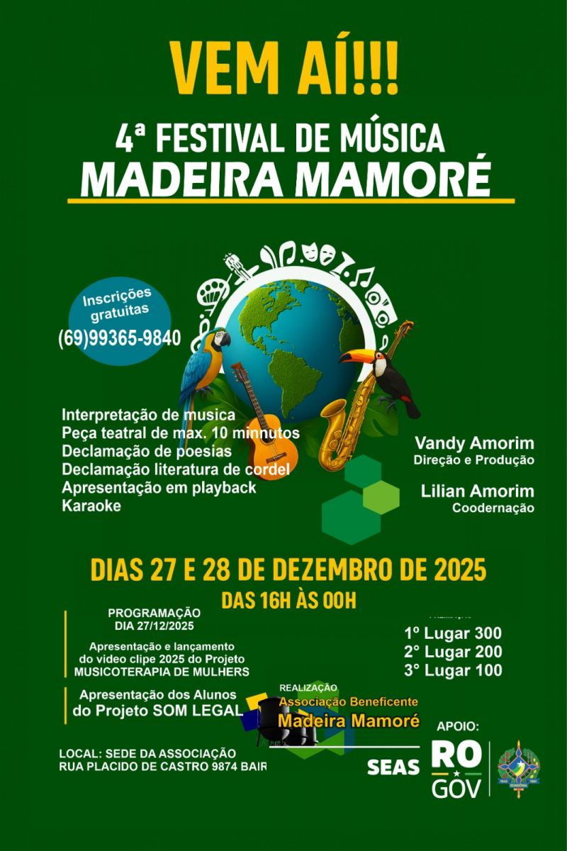 A cultura e a arte ganham destaque no fim do ano com a realização do 4º Festival de Música Madeira Mamoré, que acontecerá nos dias 27 e 28 de dezembro de 2025, na sede da Associação Beneficente Madeira Mamoré. O evento promete reunir talentos locais e regionais em dois dias de muita música, poesia e expressões artísticas.