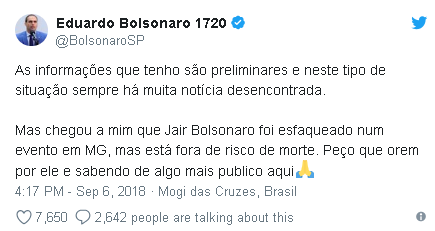 "As informações que tenho são preliminares e neste tipo de situação sempre há muita notícia desencontrada. Mas chegou a mim que Jair Bolsonaro foi esfaqueado num evento em MG, mas está fora de risco de morte. Peço que orem por ele e sabendo de algo mais publico aqui", escreveu o candidato à Câmara dos Deputados.