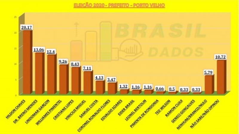 O prefeito Hildon Chaves (PSDB) aparece na primeira colocação com 20,17% das intenções de voto para a eleição majoritária em Porto Velho, aparecendo bem em sua busca pela reeleição.