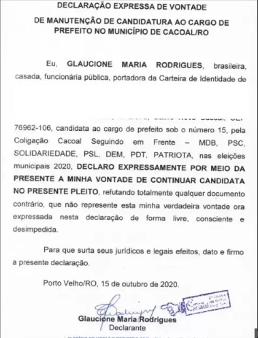 “Declaro expressamente por meio da presente a minha vontade de continuar candidata nesse pleito”, afirmou Glaucione no ofício. Ela segue presa em Porto Velho.