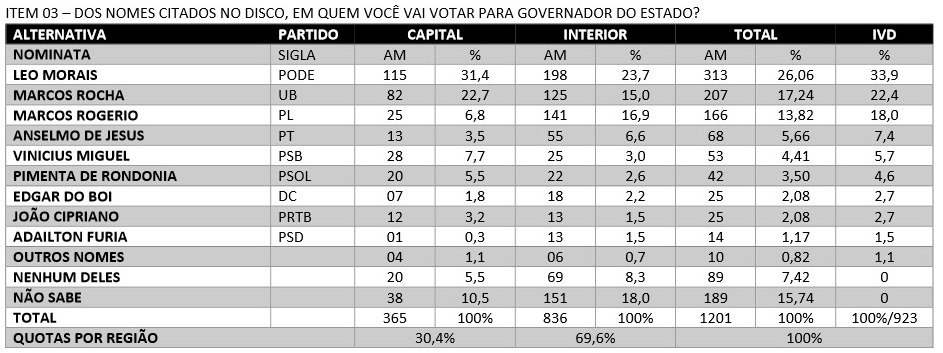 A pesquisa foi realizada entre os dias 05 a 08 de abril de 2022 com 1.201 eleitores em 14 municípios de Rondônia, com margem de erro de + ou -3% e 96% de nível de confiança.