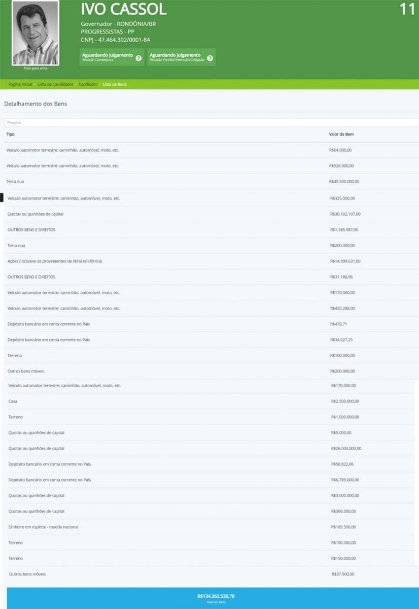 Candidato aos “45 do segundo tempo”, Ivo Cassol, do Progressistas, que já foi governador do Estado e senador da República, sem contar sua passagem pela Prefeitura de Rolim de Moura, registrou na Justiça Eleitoral um patrimônio avaliado em R$ 134.363.530,78 (cento e trinta e quatro milhões trezendo e sessenta e três mil quinhentos e trinta reais e setenta e oito centavos).