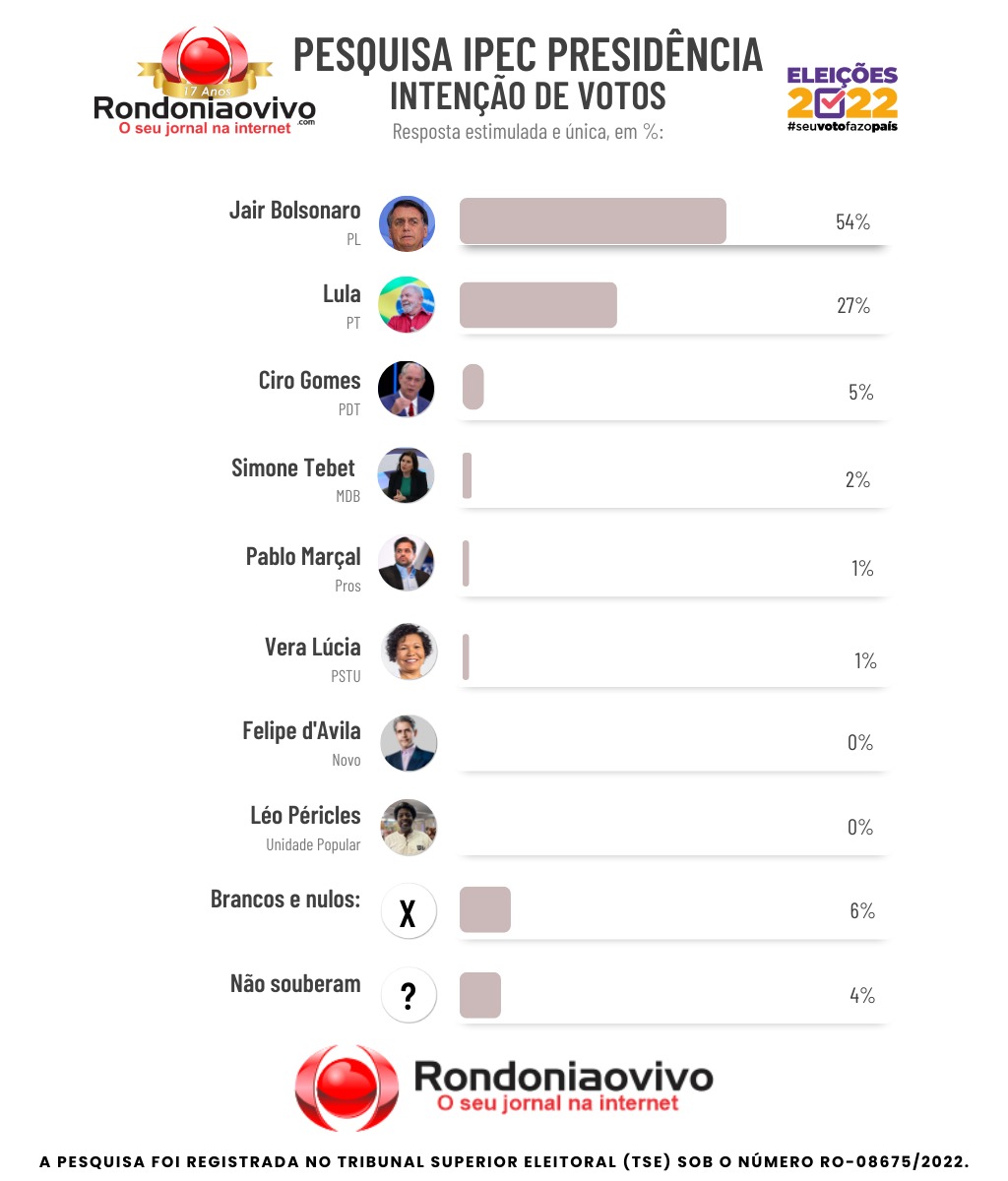 O IPEC, instituto que substituiu a marca Ibope, divulgou nesta quinta-feira (25), a primeira pesquisa com intenções de voto para a Presidência da República em Rondônia.
