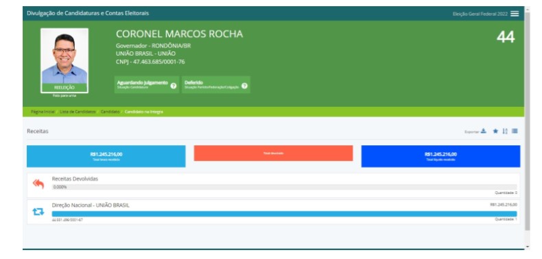 O atual Governador candidato a reeleição Marcos Rocha recebeu R$1.245.216,00 de recursos do fundo partidário em sua conta de campanha.