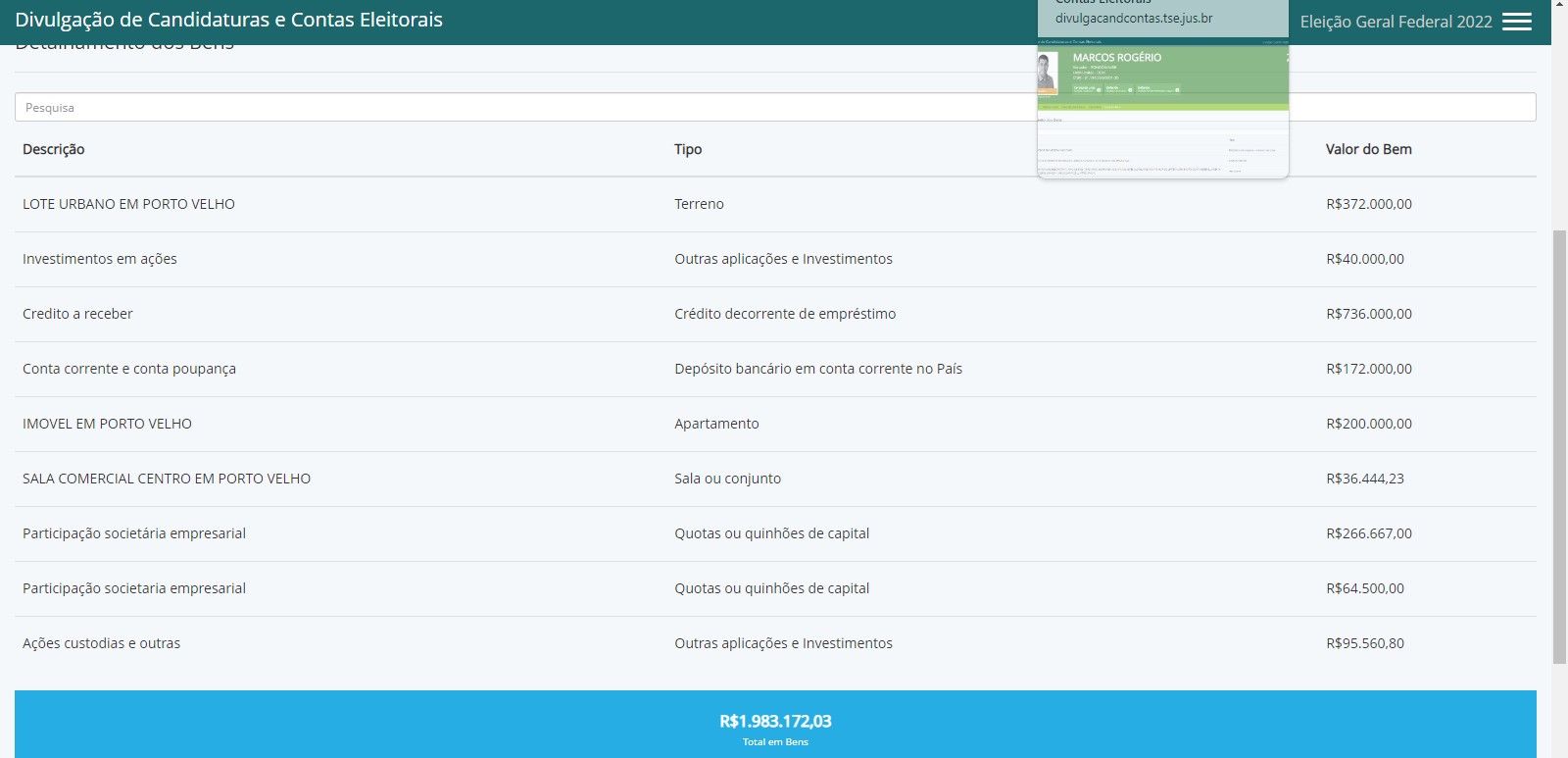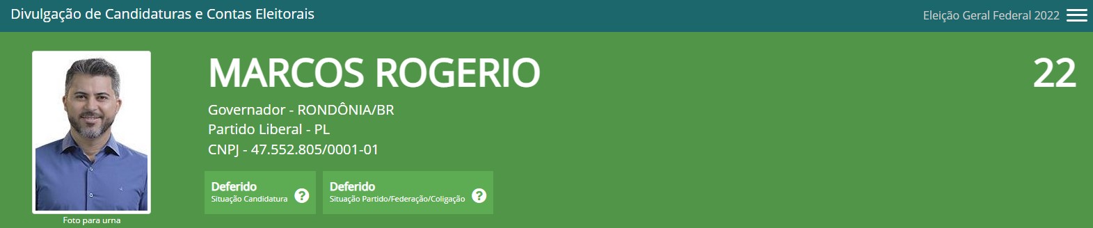 - O senador Marcos Rogério (PL) apresentou lista ao Tribunal Regional Eleitoral (TRE) com bens nos valores de R$ 2.327.000,00, sendo uma caminhonete importada (R$ 185.000,00), uma área de 68 alqueires em Vale do Paraíso (R$1.400.000,00), um apartamento em Porto Velho (R$ 580.000,00) e uma aplicação de renda fixa (R$162.000,00).