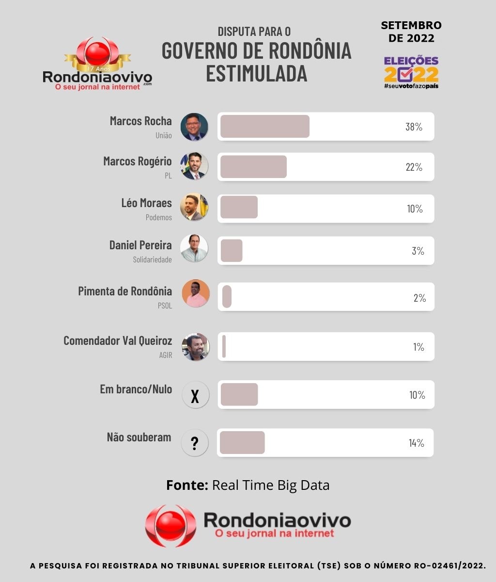 O Instituto Real Time Big Data, empresa que realiza pesquisas para a Record TV e o portal R7, apontou uma tendência de que o governador e candidato à reeleição, Marcos Rocha (União Brasil), pode vencer ainda no primeiro turno baseado apenas nos votos válidos, após levantamento divulgado na quinta-feira (15).