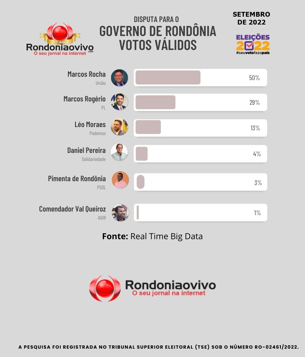 Além de estar na liderança da pesquisa estimulada, Rocha tem 50% dos votos válidos, contra 29% de Marcos Rogério (PL), 13% de Léo Moraes (Podemos), 4% de Daniel Pereira (SD), 3% de Pimenta de Rondônia e 1% de comendador Val Queiroz, que teve o registro de candidatura indeferido pelo Tribunal Regional Eleitoral.