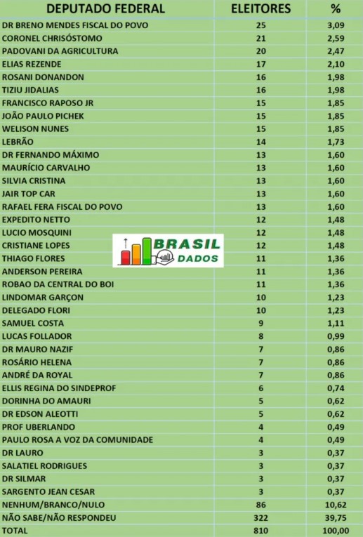 Na lista divulgada há 37 nomes de candidatos, porém Breno Mendes cresce sempre de maneira expressiva desde a primeira pesquisa, realizada por essa mesma instituição (divulgada no dia 27 de julho), até a última, divulgada recentemente, onde Breno Mendes saiu do 9º para o 1º lugar.