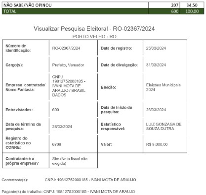 Realizado entre os dias 26 e 28 de março, o levantamento entrevistou 600 pessoas e está registrado no Tribunal Regional Eleitoral de Rondônia sob o número RO-02367/2024. Os dados foram divulgados no dia 31 de março, sendo o estatístico responsável Luiz Gonzaga de Souza Dutra.