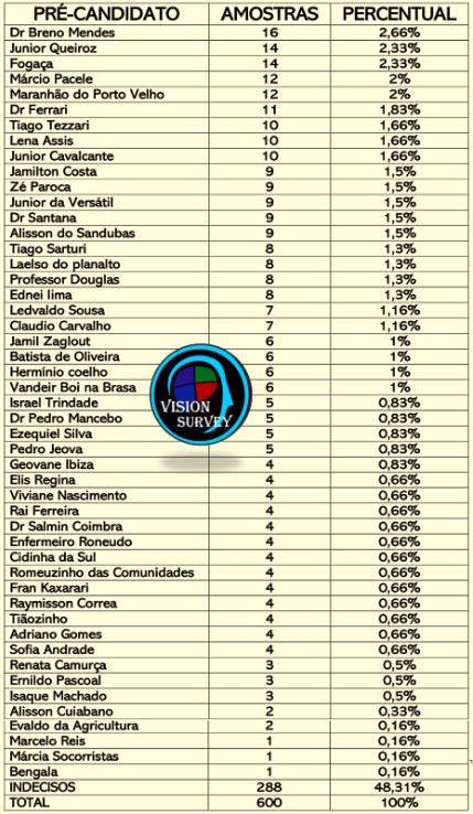 O Instituto Vision divulgou nesta quinta-feira sua mais recente pesquisa de intenção de votos para pré-candidatos a vereador de Porto Velho. Os nomes da lista não são muito diferentes das outras nominatas que já vêm aparecendo em outras sondagens divulgadas na mídia nos últimos meses.