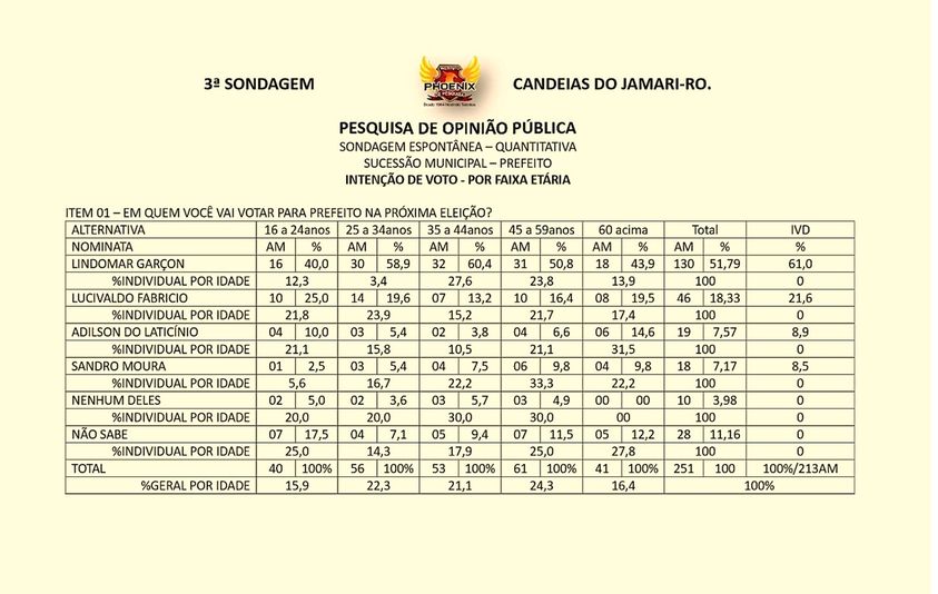 Os percentuais dos candidatos referem-se ao IVD – Índice de Votos Definidos – e não leva em conta a tendência dos eleitores indecisos. Na tabela abaixo, confira todos os votos obtidos pelos candidatos por faixa etária. Note que o candidato Garçom tem a preferência de todos os eleitores nas cinco faixas etárias da pesquisa espontânea.