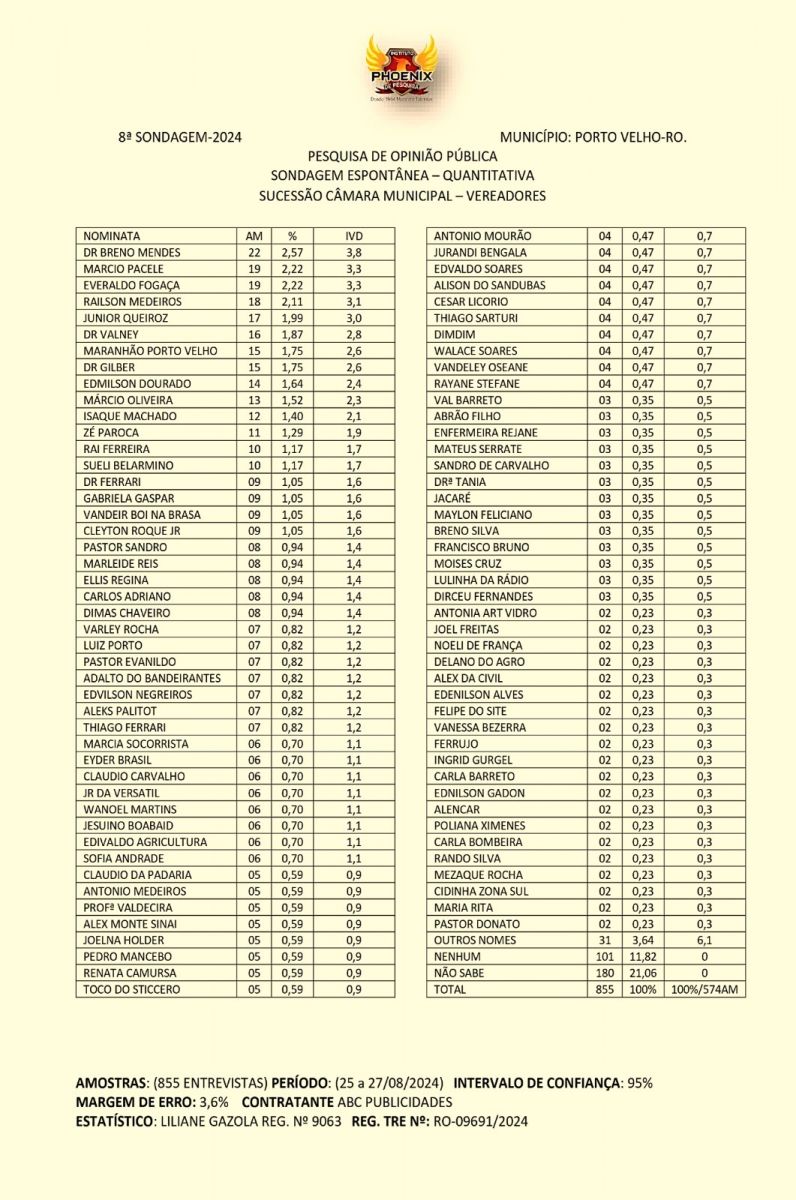 A pesquisa está registrada no Tribunal Regional Eleitoral (TRE) com o número RO-09691/2024 com 855 entrevistas entre os dias 25 a 27 de agosto, com intervalo de confiança de 95% e margem de erro de 3,6%.