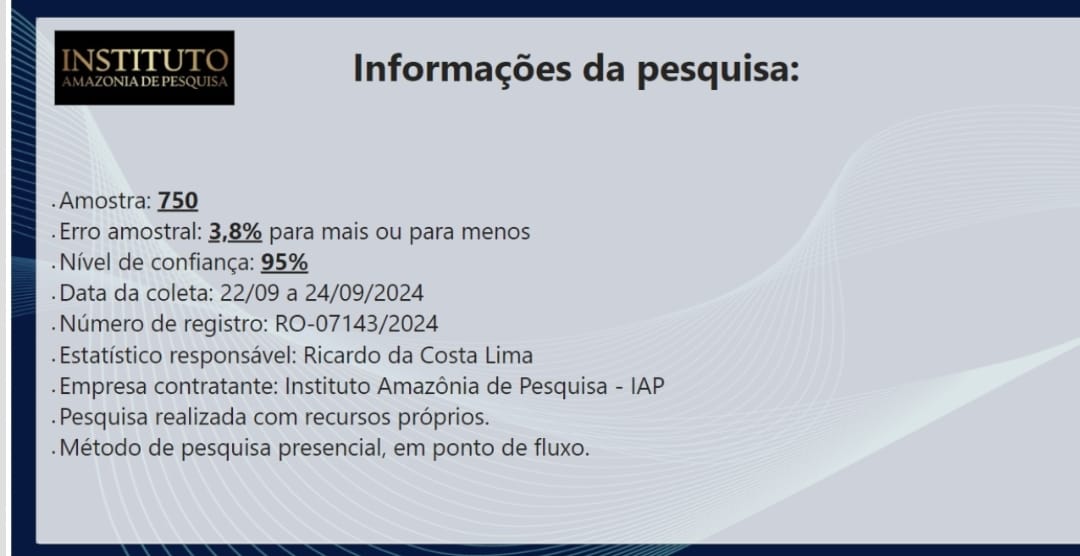 A pesquisa está registrada na Justiça Eleitoral com o número RO-07143-2024. O estatístico responsável é Ricardo da Costa Lima.