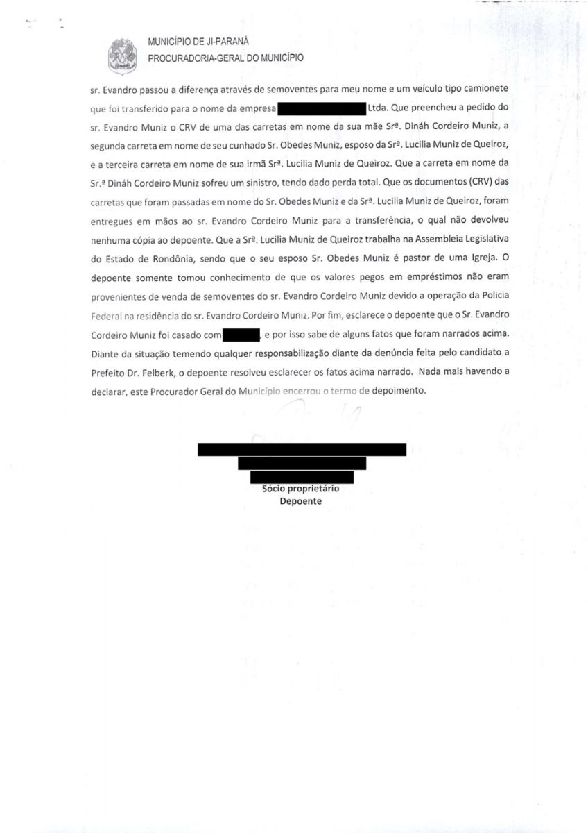 Ainda de acordo com a declaração, alguns meses depois Evandro Muniz disse que deixaria o serviço público para trabalhar na iniciativa privada, e pediu para que fossem comprados três caminhões acoplados com carretas-reboque de câmara fria.