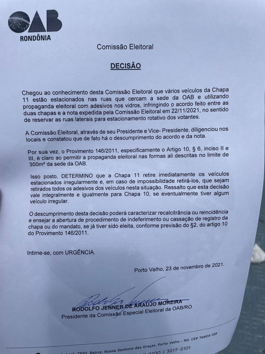 Por isso, houve a determinação da retirada imediata dos veículos com as propagandas. Caso não haja possibilidade de tirar os carros, que os adesivos sejam removidos. A decisão também vale para a chapa 10, se houver a mesma situação.