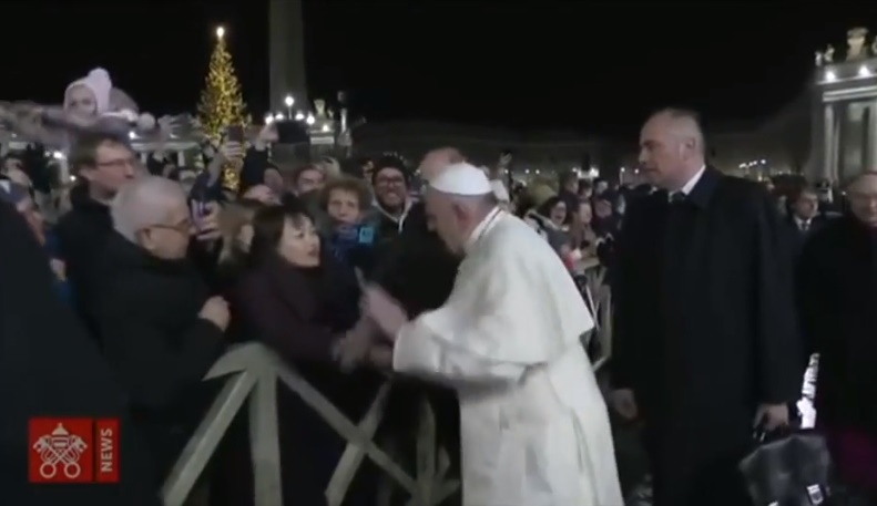 O Papa Francisco mostrou na noite de 31 dezembro que apesar de ser considerado Santo Padre também pode se irritar. Ele deu um tapa na mão de uma fiel que lhe puxou bruscamente o braço durante caminhada pelo presépio de Natal na praça de São Pedro, no Vaticano.