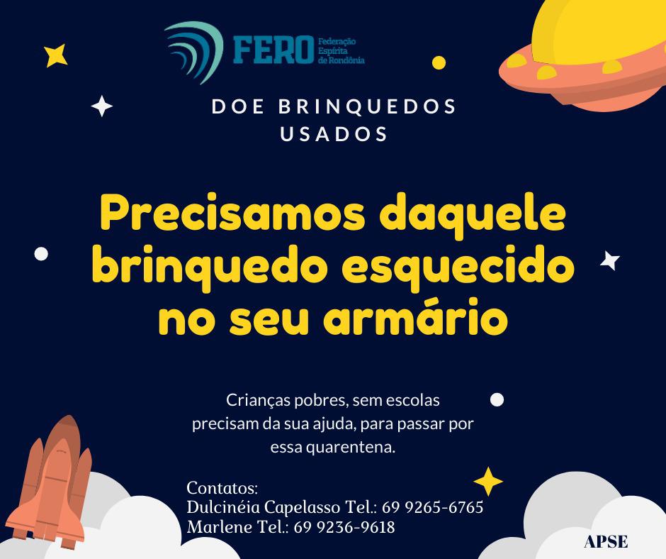 A Área de Promoção Social Espírita (APSE) da Federação Espírita de Rondônia (Fero) está pedindo a solidariedade da população portovelhense para ajudar as crianças e familias de bairros pobres da capital como Marcos Freire, Ronaldo Aragão, Ayrton Senna entre outros, com doações especialmente de brinquedos para auxiliar às familias no entretenimento das crianças que estão sem aulas devido a quarentena. Outras doações como material de limpeza, higiene pessoal, roupas e calçados para crianças e alimentos (além da cesta básica leite e ovos) farão toda a diferença na vida de muitas famílias.
