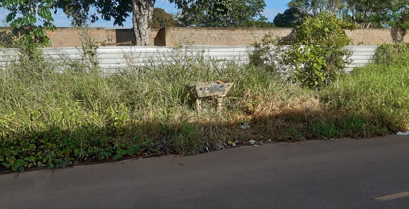 A imagem da lixeira escondida pelo matagal já dá uma ideia de quanto tempo faz que o local não recebe uma limpeza. Aliás, a lixeira está localizada no lugar onde deveria haver uma calçada.