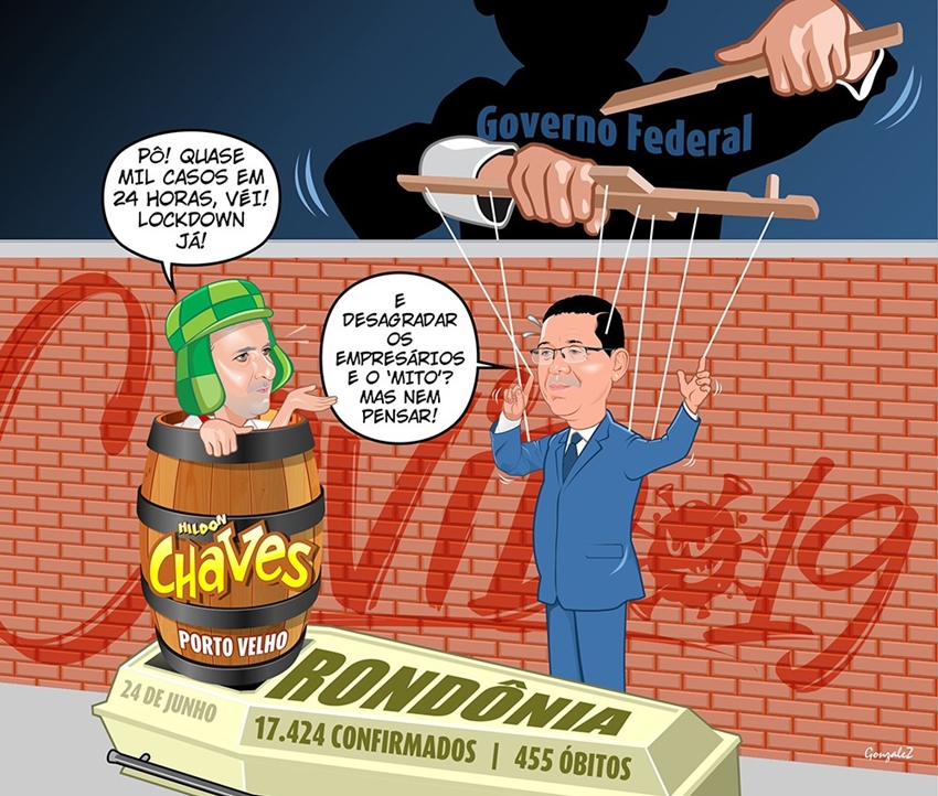 O jornalista Rondineli Gonzalez usou uma charge em suas redes sociais para opinar sobre a divergência de opiniões, relacionadas ao coronavírus, entre o prefeito Hildon Chaves e o governador Marcos Rocha.