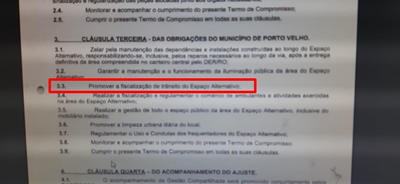 Aproveitando o envio de tal documento, percebi que o item 3.3 da cláusula terceira diz que a prefeitura teria que promover a fiscalização de trânsito no Espaço Alternativo. Não há uma criatura sequer nessa cidade que afirme ter visto, uma única vez, agentes de trânsito ou militares do Batalhão de Trânsito fazendo fiscalização lá.