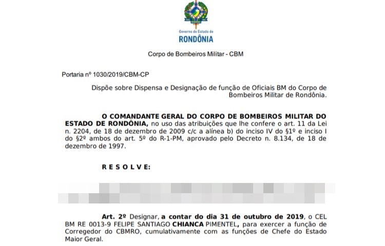 Em janeiro do ano passado, o ex-comandante Chianca entrou para o Quadro Especial dos Militares de Rondônia, uma espécie de Sala Vip para aguardar a aposentadoria. No mesmo mês, já no governo Marcos Rocha, ele foi nomeado, por decreto, assessor especial do Comandante Geral dos Bombeiros baseado em uma Lei de 2018.