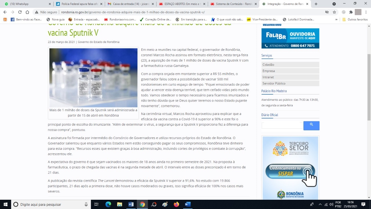 Como tudo que se escreve relacionado ao Governo de Rondônia é negativismo ou conspiração, o leitor acaba ficando sem saber a transparência dos fatos. Por um caminho que não foi o do governo, eu descobri que a Inteligência de um órgão de controle e fiscalização avalizou a compra das vacinas.