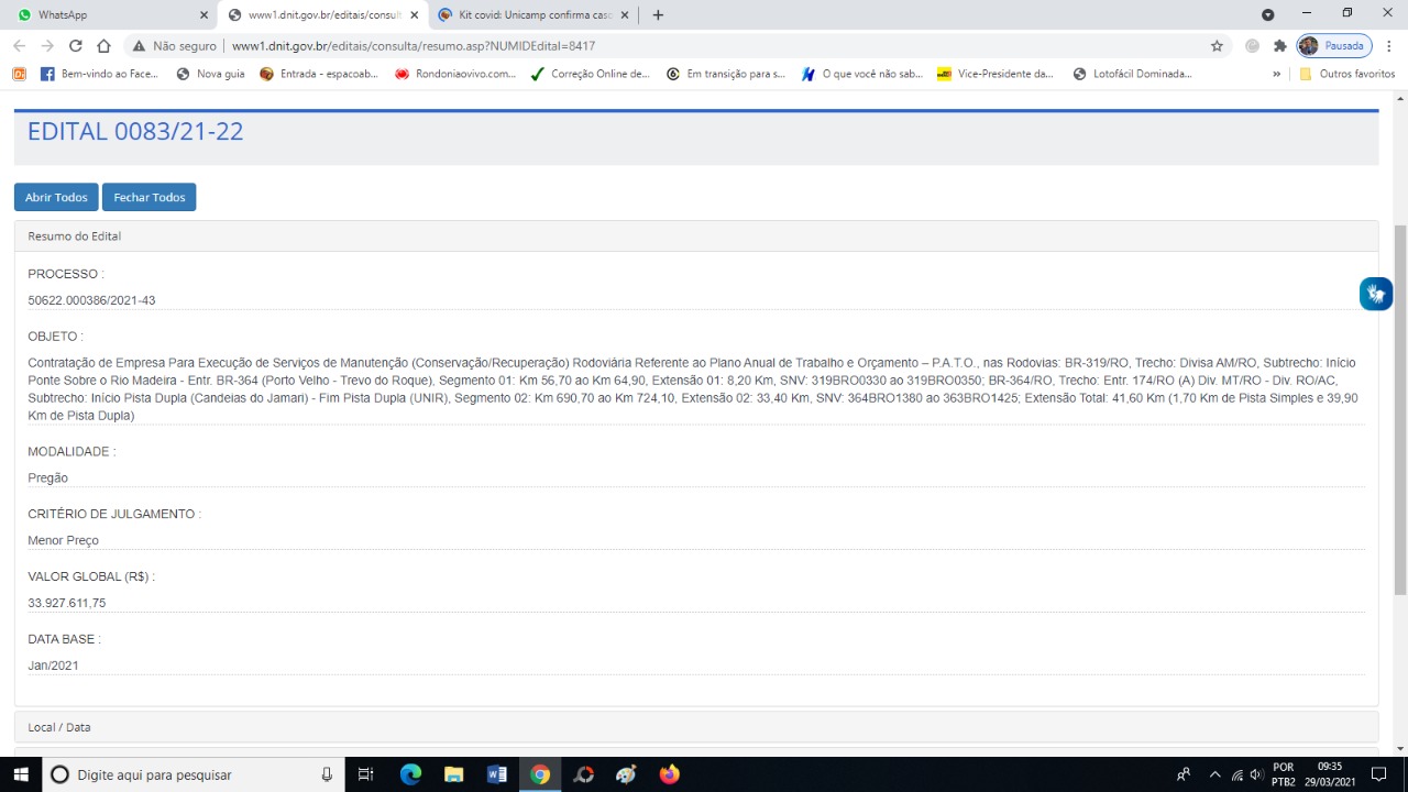 O edital classifica como Subtrecho o trabalho que vai da Ponte Sobre o Rio Madeira até Candeias do Jamari.