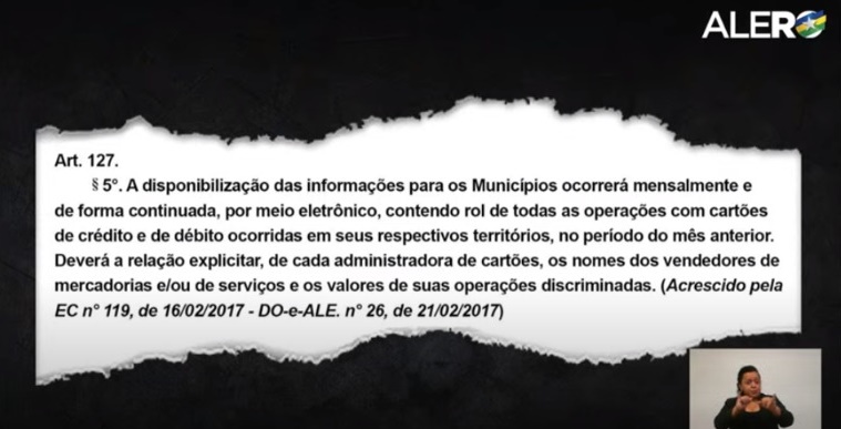 No artigo 127, está escrito que o Estado deve elaborar um arquivo e informar as operações com cartão para que os municípios possam fiscalizar e recolher o imposto sobre Serviço de Qualquer Natureza.