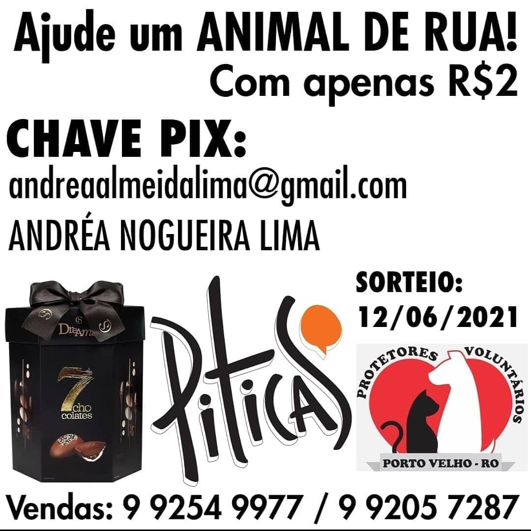 Rifa solidária vai arrecadar recursos para animais de rua de Porto Velho. Sorteio acontece no dia dos namorados; Bilhetes custam apenas 2 reais e dão direito à concorrer a um vale compras de 100 reais e um super ovo de Páscoa da Cacau Show.
