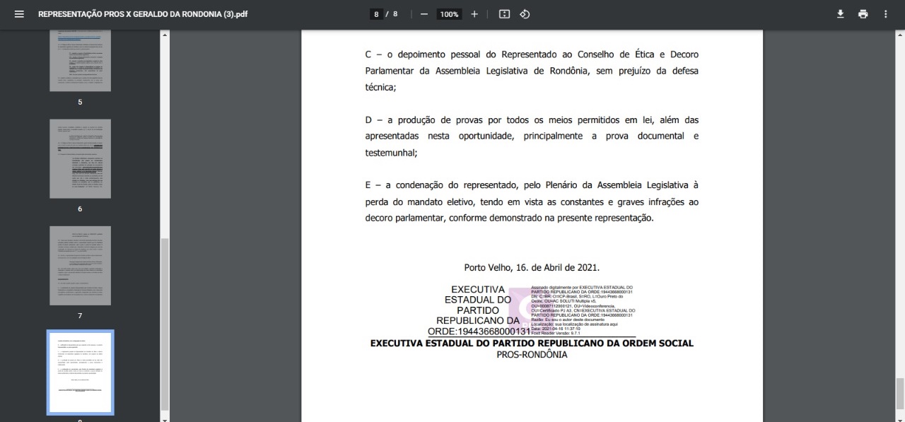No requerimento encaminhado pelo Prós, foram enumeradas algumas situações vergonhosas protagonizadas por Geraldo da Rondônia. O partido enfatiza que provas sobre a conduta inadequada do parlamentar existem de sobra.