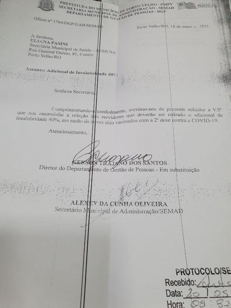 Circula entre os profissionais de saúde de Porto Velho, um ofício do secretário Municipal de Administração, Alexey da Cunha, à Secretaria Municipal de Saúde (Semusa), pedindo a retirada do adicional de 40% para quem está atuando na linha de frente da pandemia.