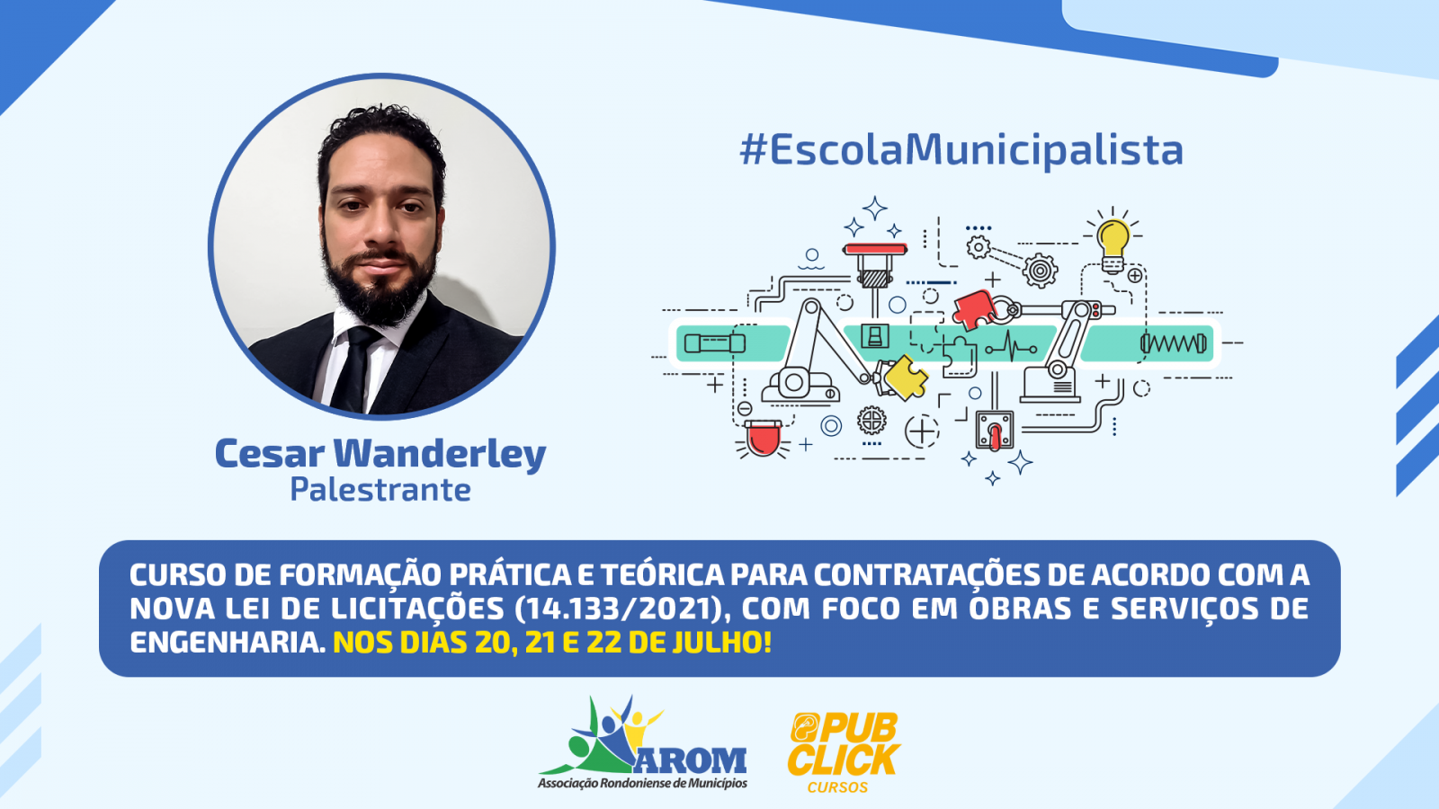 Advogado e especialista em Licitações e Contratos, César Wanderley, palestrará em Curso Inédito de Formação Prática e Teórica para Contratações, de acordo com a nova Lei de Licitações (14.133/2021), com foco em Obras e Serviços de Engenharia, evento conjunto da Associação Rondoniense de Municípios (AROM) e da empresa PubClick Cursos, nos dias 20, 21 e 22 de julho.