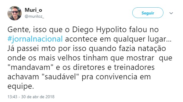 A entrevista do atleta gerou grande repercussão na internet. Em alguns comentários, internautas contaram ter passado por violência semelhante a do ginasta. “Gente, isso que o Diego Hypolito falou no #jornalnacional acontece em qualquer lugar… Já passei muito por isso quando fazia natação, onde os mais velhos tinham de mostrar que mandavam e os diretores e treinadores achavam saudável para a convivência em equipe”, disse um seguidor.