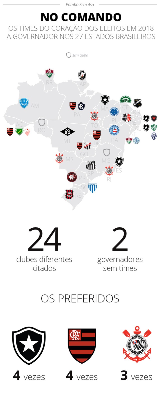 As eleições deram o que falar. E o que faltava não falta mais. Depois de apresentar os times dos então candidatos à presidência do Brasil (Para lembrar: Bolsonaro é Palmeiras e Botafogo), o blog ‘Pombo sem asa’, como já é tradição de outros carnavais, mostra agora os clubes do coração dos 27 governadores, eleitos ou reeleitos na última corrida.