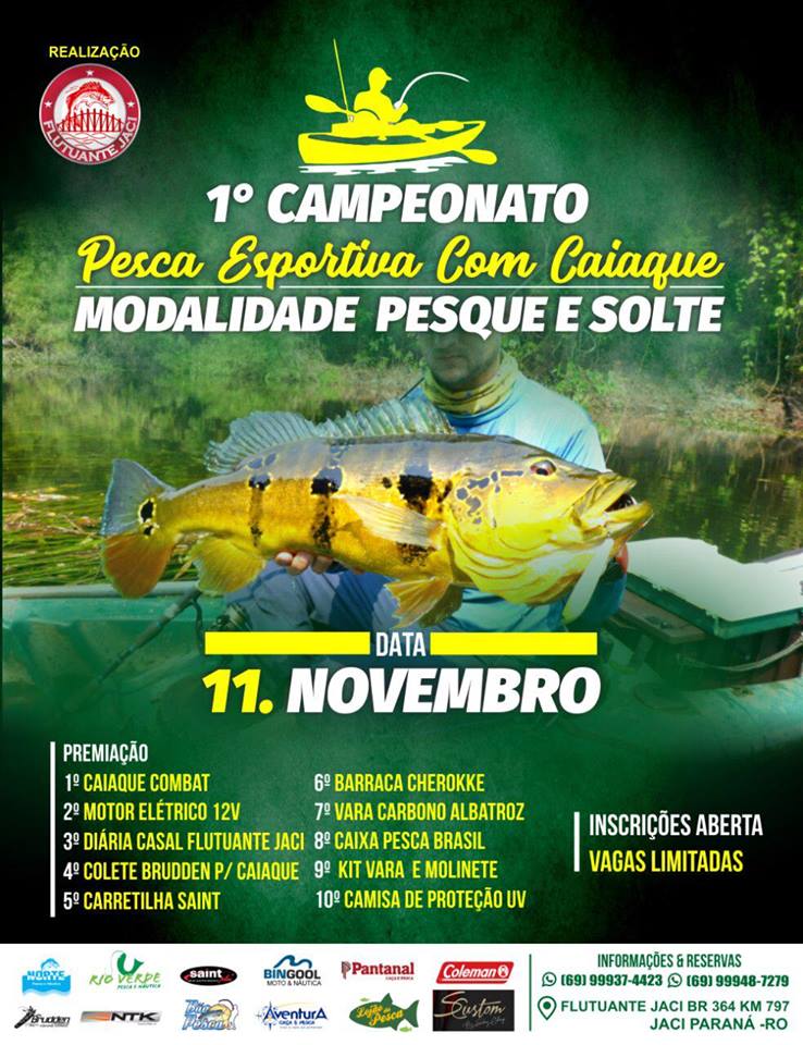 Confira os prêmios do Campeonato Pesca Esportiva Com Caiaque, na modalidade pesque e solte. O evento acontece no próximo dia 11 de novembro. A Aventura Caça e Pesca em parceria com a Bruden está patrocinando o 1º lugar do prêmio “Caiaque Combate” do Campeonato Pesca Esportiva com Caiaque.