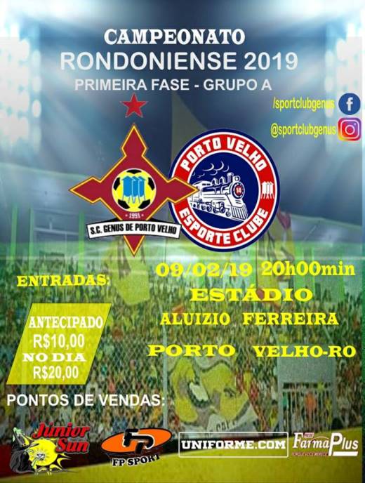 A partida marca a estreia do Genus no Estadual 2019. Já o Porto Velho entra em campo em busca da sua segunda vitória na competição, pois no último sábado o Tricolor da Capital goleou o Guajará por 4 a 0 no estádio Aluízio Ferreira.