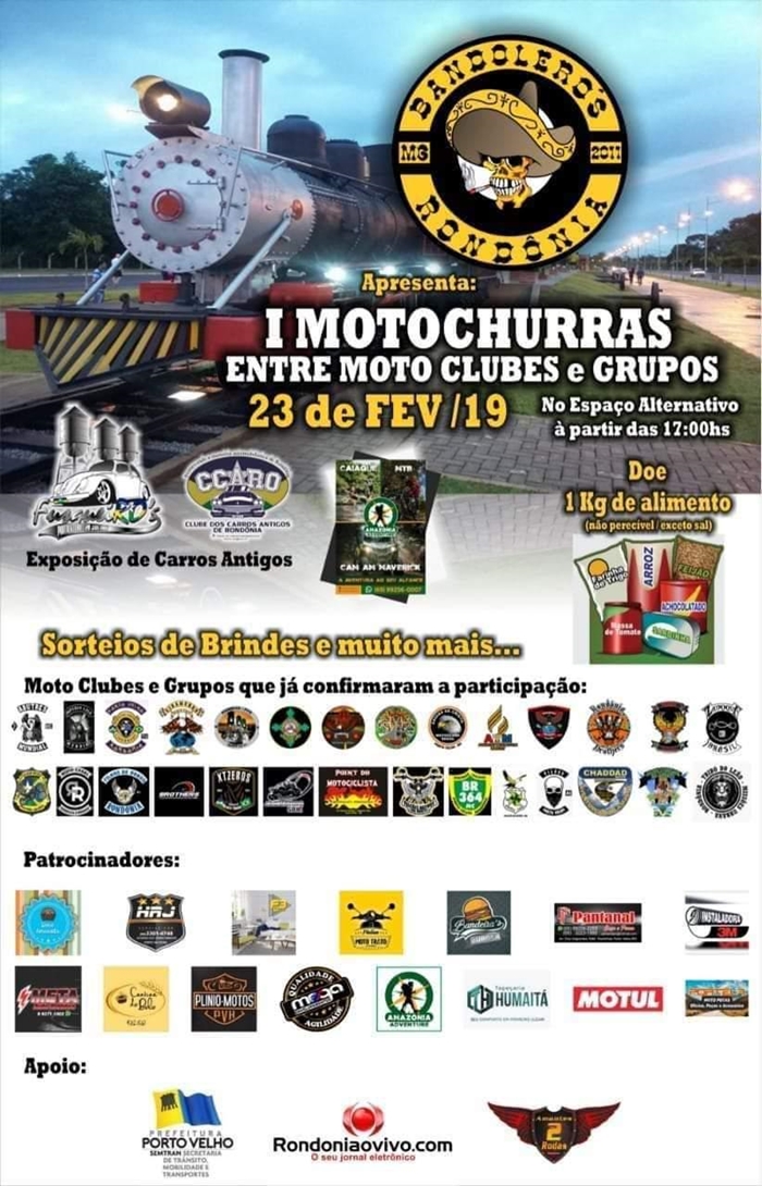 O 1º Motochurras entre moto clubes e grupos de motociclistas acontece no próximo sábado(23/02), às 17 horas, no Espaço Alternativo, em Porto Velho. Para participar basta doar 1 kg de alimento não perecível.