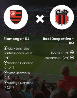 Primeiro tempo bem disputado e terminou empatado em 1 a 1, Marx abriu o placar para o Flamengo, mais logo em seguida Lucas Bahia deixou tudo igual para o Real Ariquemes. Na volta do intervalo os donos da casa, impôs o rítmo do jogo e Rodrigo Muniz marcou duas vezes e Vitor Ricardo fez o quarto gol do Flamengo.