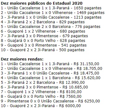 Somando os dez maiores públicos pagantes o Estadual chega a 8.965 na atual temporada, bem abaixo do número alçado nos dez maiores públicos da temporada que alcançou 15.947 pagantes em 2019